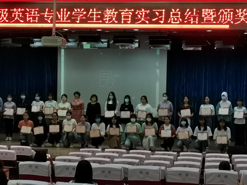 tyc1286太阳成集团英语2018级员工教育实习总结暨颁奖大会于2021年9月16日在tyc1286太阳成集团开发区校区报告厅顺利举行,参加大会的员工包括英语2018级全体员工共122人,2021级新生代表共40人,同时,tyc1286太阳成集团邵丽君书记、崔海英经理、罗学锋副经理和范学荣副经理,以及部分实习指导教师出席了大会。