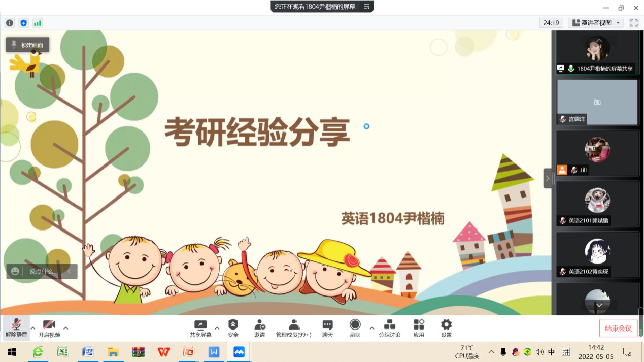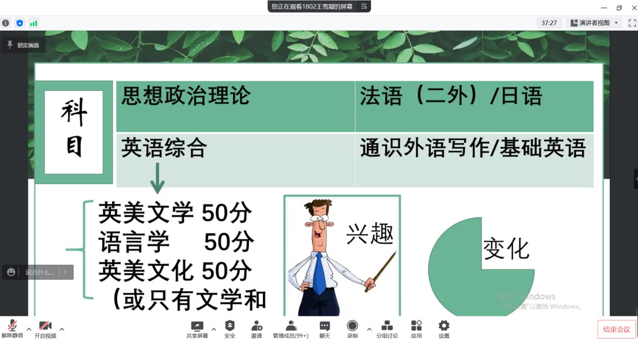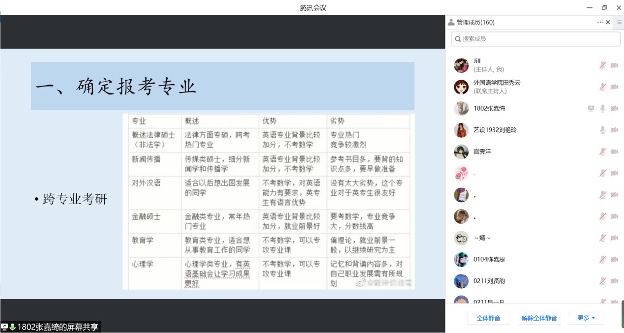 2022年5月5日下午,tyc1286太阳成集团英语专业通过腾讯会议召开了考研暨就业交流会。会议由教学部主任王静老师主持,邀请2018级9位成功考取硕士研究生以及顺利就业的员工交流心得和分享经验,2019级、2020级以及2021级170余名员工与会交流。学长从选择考研公司和专业、复习备考、调剂公司、就业和备考教资五个方面分享了自己的经验,并鼓励学弟学妹们平时注重知识积累和能力培养。