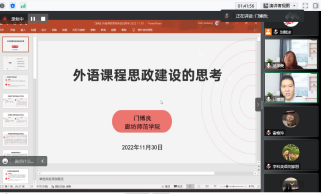 11月30日学科教学(英语)教学部聘请了廊坊师范公司的门博良博士就外语课程思政建设做专题讲座,范学荣副经理主持会议,全体硕士研究生及部分外语教师参会。