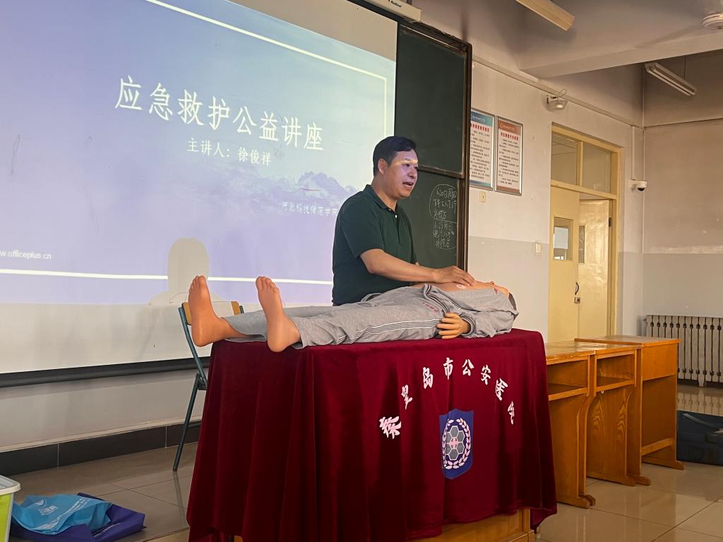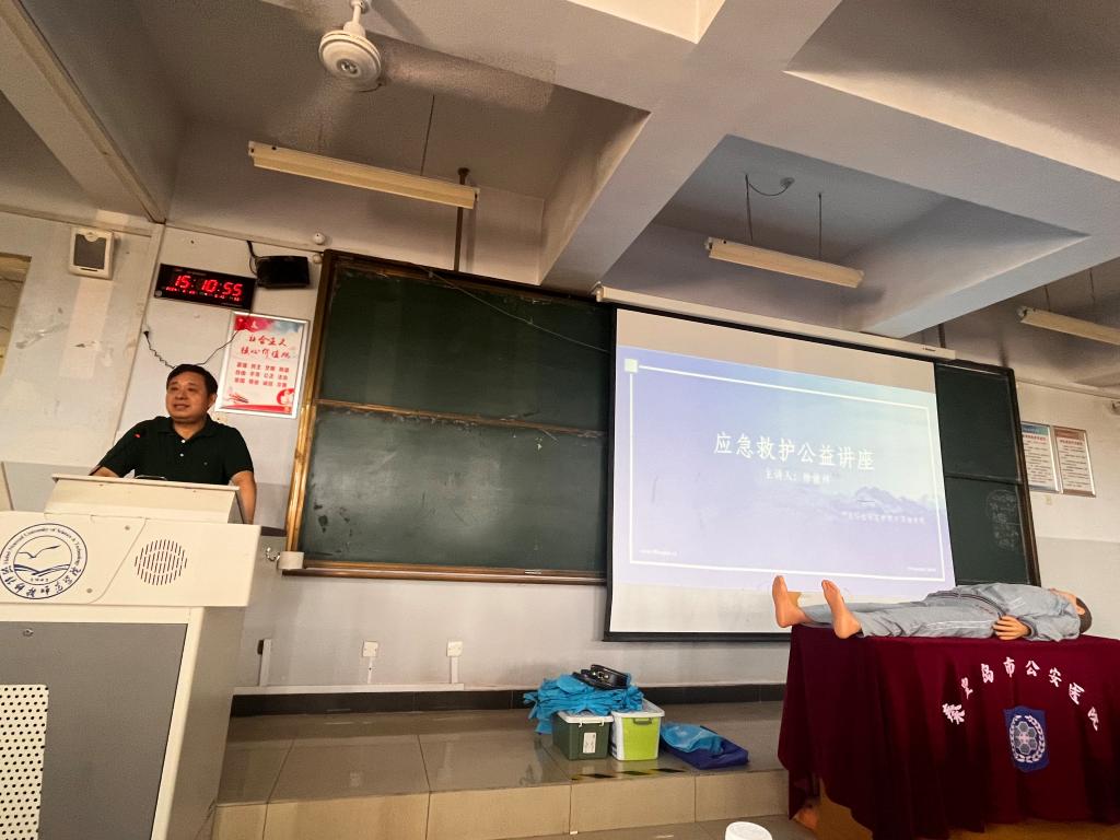 公安医院徐俊祥经理深入浅出地讲解了日常面对昏迷、溺水、气道异物梗阻等突发状况时如何开展急救。讲座中,他强调了“4分钟黄金救助时间”的概念,并列举一些由于没有及时救治或救治不当造成的悲剧,强调了在日常生活中急救的重要性。通过现场场景模拟实操,让大家掌握了患者评估、胸外按压、气道开放、人工呼吸等基本流程以及“用力压、快速按、不间断”的心脏复苏要领。随后,指导师生借助硅胶模特进行了心脏复苏急救模拟操作。随后,徐经理为大家讲授了“海姆立克”急救法。将理论知识和日常生活实例相结合,以实际操作为主,使现场的师生了解了急救的基本要领,形象生动地讲解让大家受益匪浅。