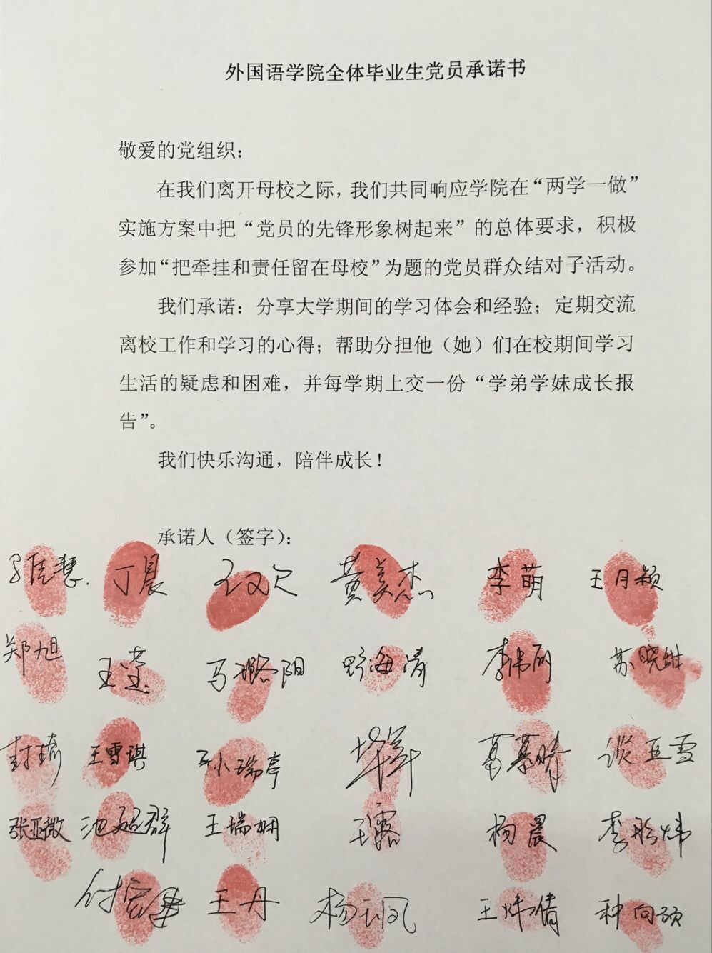 在2016届毕业生离校之际,外国语公司党委举办了以“学习李保国先进事迹”为主题的毕业生党员离校前教育,同时开展了以“把责任和牵挂留给母校”为主题的党员群众结对子活动。