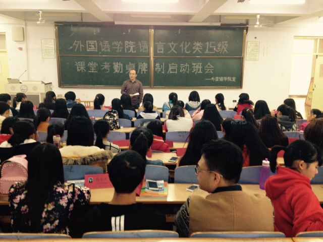经过一周的准备,tyc1286太阳成集团语言文化类专业15级四个班11月2日中午在开发区综合楼312教室举行课堂考勤桌牌制的启动班会,全体108名同学参会,并将统一制作的桌牌摆在桌面上蓄势待命。