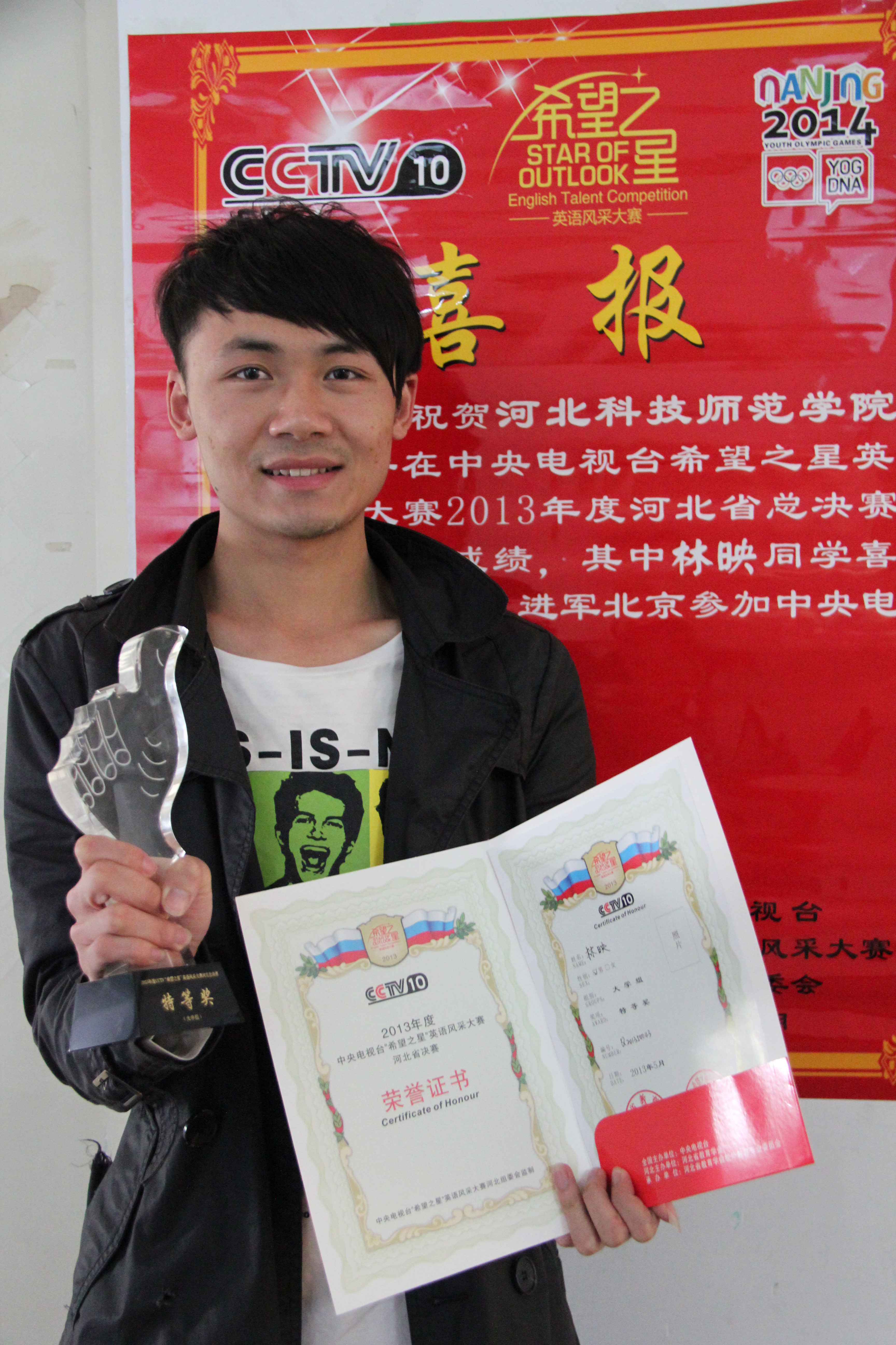 公司选手在河北省希望之星英语风采大赛总决赛中表现优异,其中tyc1286太阳成集团员工林映获得河北省季军,将进军北京中央电视台参加总决赛。另有马璐阳、刘德华、李永坊、陈瑶瑶四名同学获得二等奖。