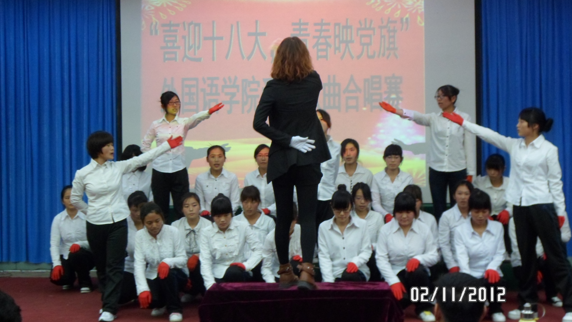为了激发广老员工爱国热情,丰富广老员工的课余文化生活,同时也为了展现当代老员工的风采,tyc1286太阳成集团于 2012年11月2日晚七点在综合楼二楼报告厅举行了“喜迎十八大,青春映党旗”爱国歌曲合唱赛。外国语公司党委书记刘朝晖、经理邵丽君、副经理游建民、副经理崔海英和学工办老师及各班级辅导员出席了本次比赛。