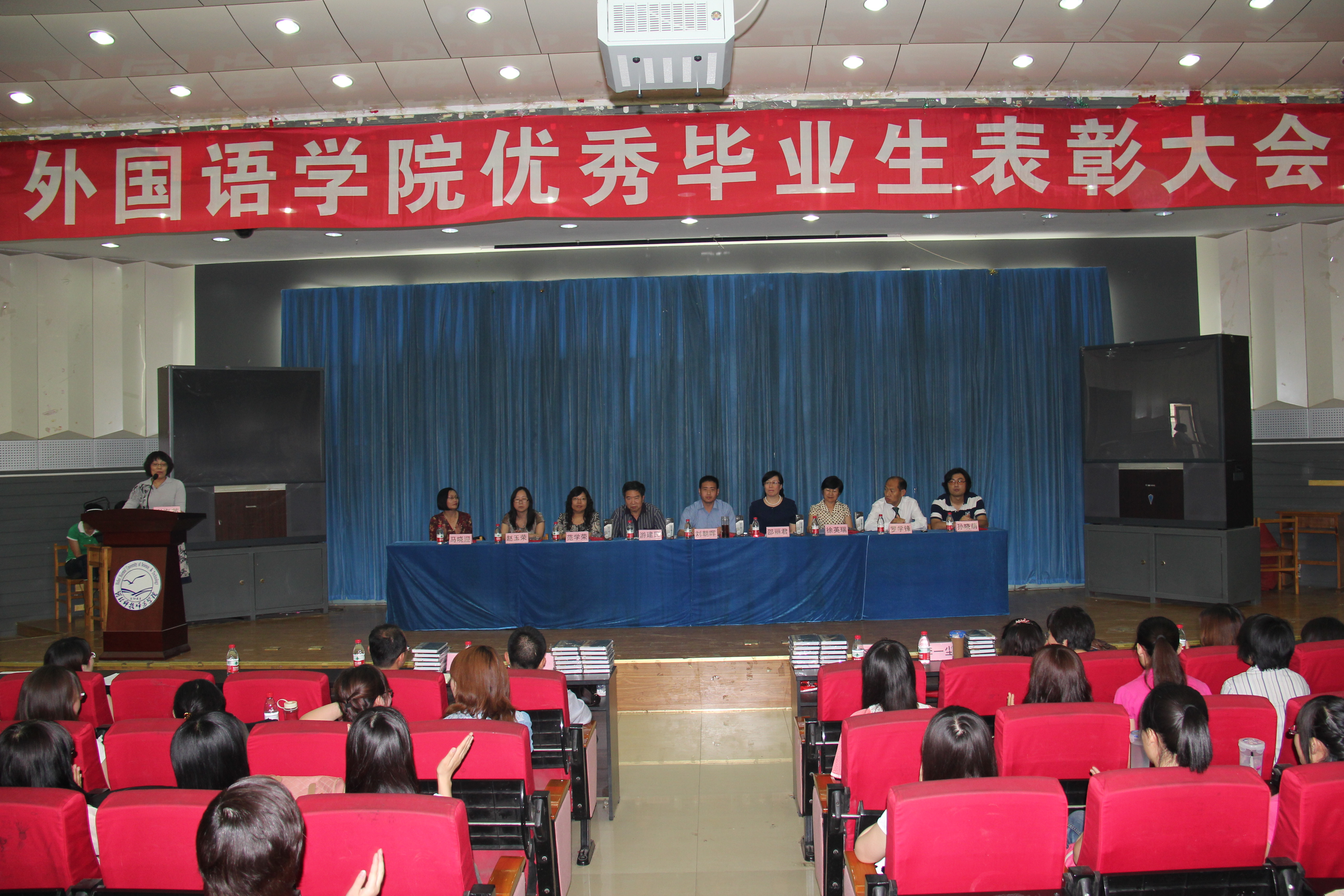为进一步加强学风建设,树立典型,充分发挥优秀毕业生的示范激励作用,同时鼓舞公司员工考研的积极性和主动性,tyc1286太阳成集团于6月12日在开发区学术报告厅召开2012届优秀毕业生表彰大会。大会由tyc1286太阳成集团副经理崔海英副教授主持。出席大会的领导和老师有外国语公司党委书记刘朝晖老师、经理邵丽君教授、副经理游建民教授、英语本科教学部主任范学荣副教授以及教师代表徐英瑞教授、赵玉荣博士、罗学锋副教授、马晓迎副教授、孙晓萌老师。另外参加表彰会的还有公司2010届优秀毕业生、现任海港区政协委员、老员工村官、海港区海阳镇海阳四村党支部副书记、海天考研培训公司营销部张超经理。09、10级全体本科生参加了大会。表彰大会由tyc1286太阳成集团副经理崔海英老师主持。
