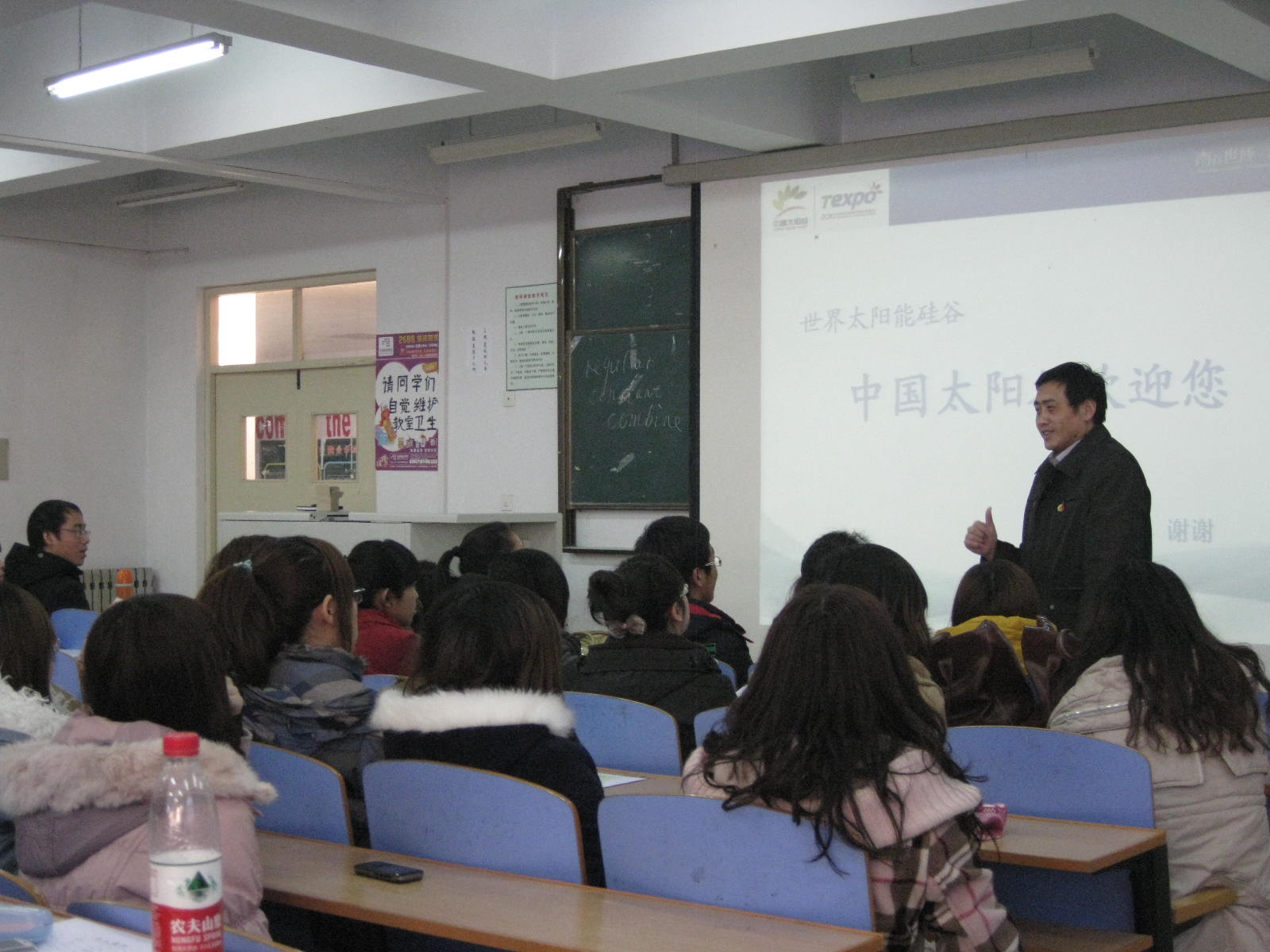 首先,皇明太阳能股份公司的招聘代表佟女士为毕业生播放皇明太阳能“太阳谷”的宣传片,之后将皇明太阳能股份有限公司的公司规模、产品研发、产业布局、发展前景、招聘岗位、基本待遇等情况向毕业生做了较为详细的讲解,并诚挚的邀请tyc1286太阳成集团的员工加入皇明,同时也欢迎大家有机会去皇明公司参观考察和实习。讲解后,刘朝晖书记代表公司欢迎皇明太阳能股份有限公司佟女士一行,并谈到自己去皇明公司考察的经历,要求全体毕业生转变观念,面向市场。通过对行业和企业的分析,鼓励大家去皇明太阳能实习就业。