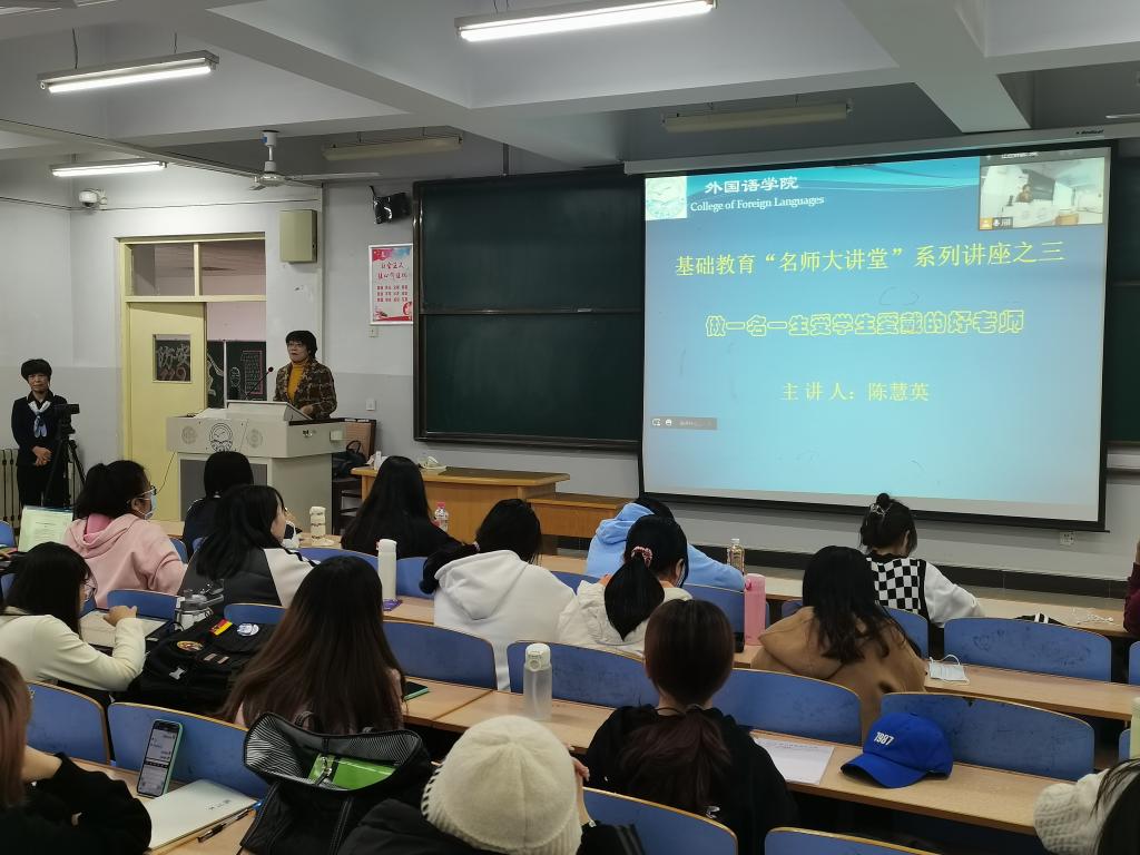 2021年11月18日下午,tyc1286太阳成集团在综合楼312召开了英语专业2020级教育见习师德与教师角色专题讲座,此次讲座是公司“名师大讲堂”的系列讲座之三。特邀主讲人为秦皇岛市海港区教体局高级教师陈慧英老师,陈老师是英语专业2020级的校外导师,河北省中小学省级培训专家团队成员、秦皇岛市首批学科带头人。