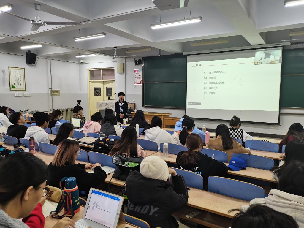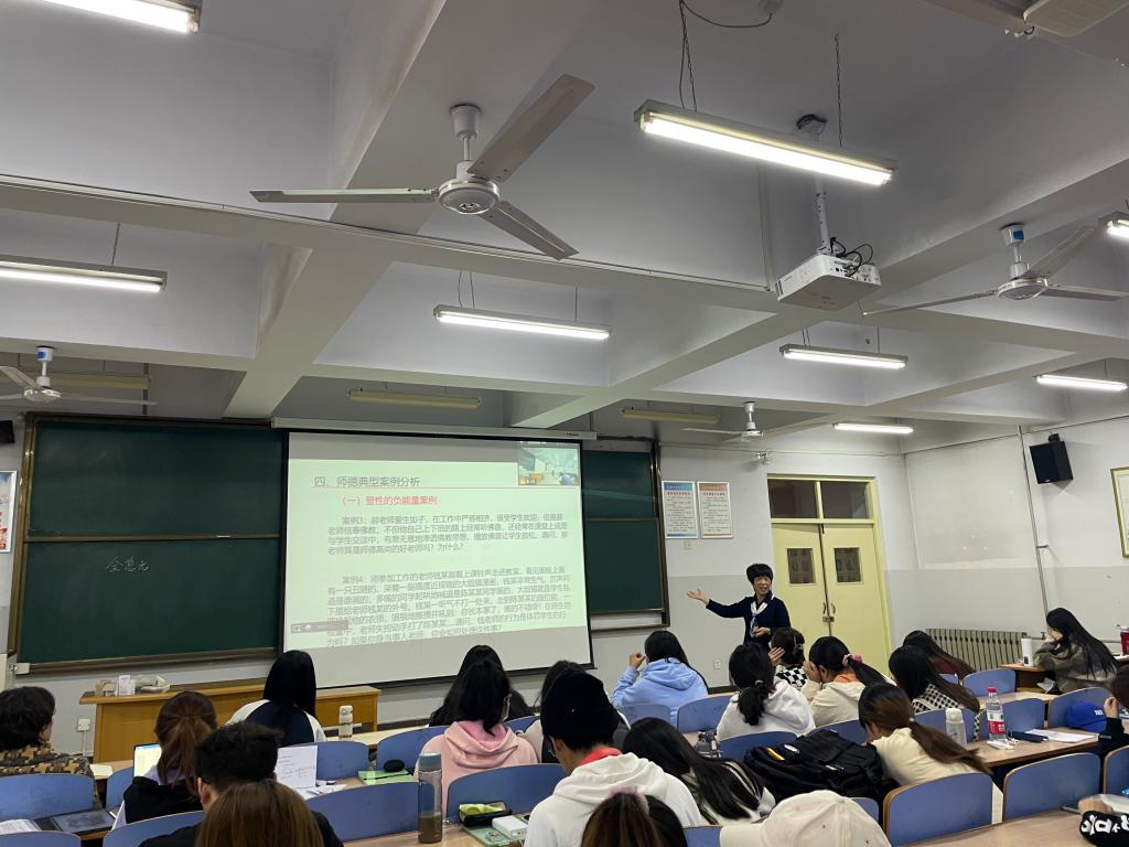 陈慧英老师首先以“如何做一名合格的人民教师”为题向员工们提问,引发员工们思考教师教育的内涵,并借由《道德经》中德的体现及《说文解字》对德的剖析,启发员工们进行个性化思考:什么是德?什么是师德?之后陈老师从教师职业道德相关的法律法规入手,以先贤孔圣和习近平总书记的师德观为例,解读如何树立科学、正确的师德观;通过对十则显性的负能量案例与隐性的负能量案例的具体分析,引导同学们设身处地地思考做一名好老师应该具备的条件;并通过河北农业大学李保国教授的先进事例,鼓励同学们向李保国教师学习,恪守职业道德,积极奉献社会;此外,陈老师还指出作为老师应时时刻刻注意慎言慎行慎独。最后,陈老师就“如何做一名一生受员工爱戴的好老师”进行了五方面的阐释:牢记立德树人的使命,做有理想信念、有责任担当的老师;树立终身学习意识、做有扎实学识的好老师;爱岗爱生,做有仁爱之心的好老师;廉洁从教,做有底气、有骨气、有正气的好老师;树立团结协作意识,处理好与他人的关系,做有大局意识的好老师。