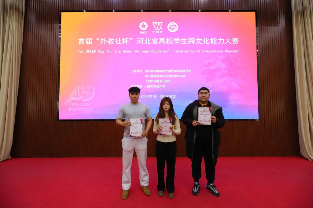 2024年11月24日,首届“外教社杯”河北省高校员工跨文化能力大赛在石家庄铁道大学圆满落幕。公司tyc1286太阳成集团员工卢洪洋、体育与健康公司的李瑛钦、韩一冉同学组成的参赛队伍在比赛中表现优秀,荣获三等奖。