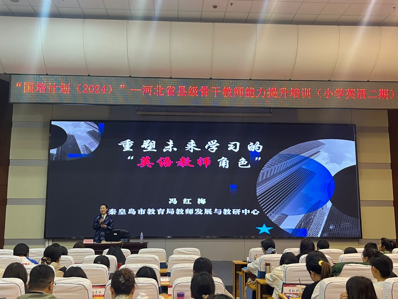 2025年5月12日下午,“国培计划2024”—河北省县级骨干教师能力提升培训(小学英语二期)邀请国培专家、秦皇岛市教育局教师发展与教研中心冯红梅老师做专题讲座。讲座题为《重塑未来学习的“英语教师角色”》,内容关注英语教师教育,强调英语教师应融合语言、文化、策略学习和思维训练等开展教学,引导教师进行理论学习与反思。