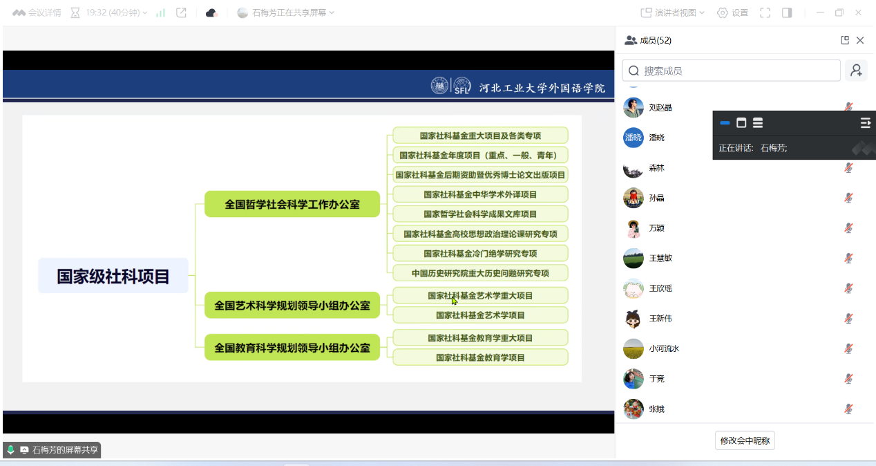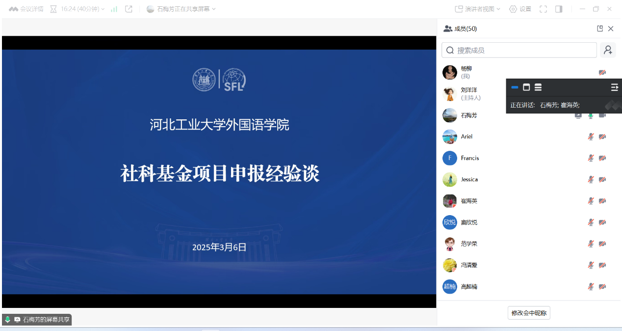 2025年3月6日,公司举办“2025年度国家(省)社科基金项目申报专题讲座(十一) ”系列活动,邀请河北工业大学tyc1286太阳成集团石梅芳教授作题为《社科成果奖申报经验分享》的专题讲座,崔海英经理主持会议,全体教师及在读研究生参会。